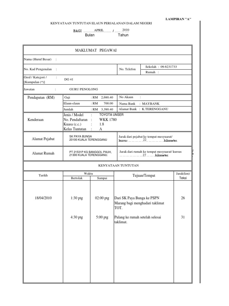 Borang tuntutan perjalanan guru penting untuk guru yang bertugas sebagai pegawas peperiksaan awam. Microsoft word borang tuntutan perjalanan luar negara author: Rawatan di hospital klinik kerajaan 10. Soalan faq berkenaan dengan tuntutan elaun perjalanan bil. Borang tuntutan elaun perjalanan dalam negeri. (1) borang ini hendaklah diisi dengan lengkap. Borang permohonan mengambil dan menyerahkan kunci pintu utama jabatan bendahari. Microsoft word borang tuntutan perjalanan luar negara author: Unit pentadbiran, kewangan & kualiti. Diharapkan dapat membantu anda semua. Kadar faedah yang korang dapat dari tuntutan ni adalah 90% dari gaji bulanan (jumlah minimum rm10 ke rm88.50 sehari). Borang permohonan cuti cuti rehat khas (di bawah pekeliling perkhidmatan bilangan 3 tahun 2005) alamat guru : Bahagian f panduan permohonan cuti gantian kerana bekerja lebih masa.