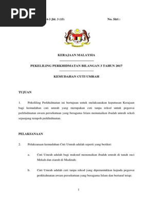 Yang beragama islam dan bertaraf tetap selama 7 hari (tidak termasuk hari cuti umum) sebagai cuti tanpa rekod. Cuti umrah adalah tidak termasuk hari rehat mingguan, hari kelepasan mingguan dan hari kelepasan am Borang permohonan kemudahan cuti tanpa rekod (cuti umrah). Dalam perbentangan bajet 2018 pada bulan oktober tahun lalu, satu pekeliling berkenaan cuti rehat khas. Siti saleha, shukri yahaya, kazar saisi, liza abdullah, syazwan zulkifly, wan sharmila, jaja iliyes, bil azali, shaharuddin thambi, jasmin hamid.
