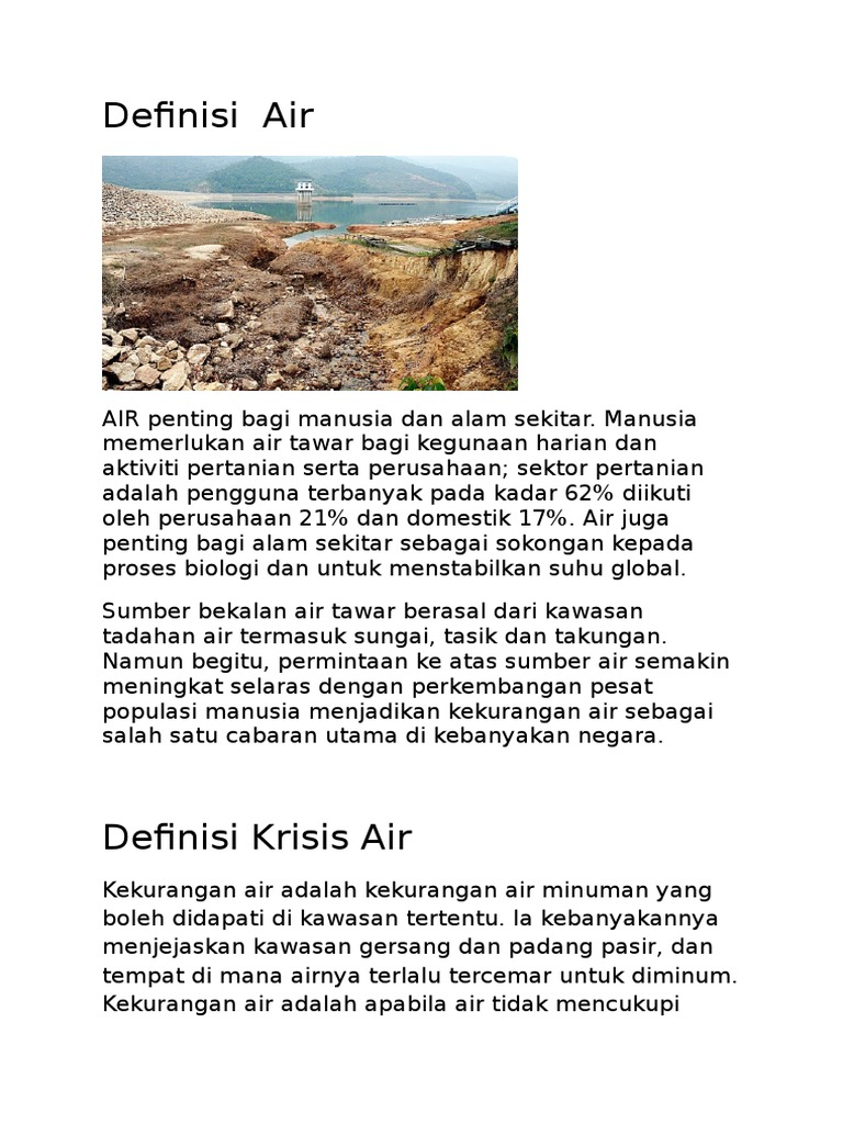 Pdf Kesan Krisis Air Di Selangor Farihin Ahmad Academia Edu from 0.academia-photos.com Walaubagaimanapun malaysia tidak terlepas dari masalah bekalan air yang sering berlaku di beberapa kawasan di negara kita dan kini serius diperkatakan. Walau apa pun puncanya kita perlu mengambil langkah berjaga jaga bermula dari. Semasa krisis memuncak, semua negara yang dilanda krisis mengalami kejatuhan nilai matawang, nilai pasaran saham dan kejatuhan nilai aset. Kerajaan juga telah menunjukkan komitmen untuk menjadikan sektor itu lebih cekap, untuk mewujudkan mekanisme pendanaan yang mampan dan untuk meningkatkan orientasi pelanggan penyedia perkhidmatan. Lebih memburukkan lagi krisis sumber air bersih ialah apabila simpanan air bawah tanah juga semakin berkurangan. Sumber air tersebut adalah satu eleman yang sangat penting dalam kehidupan manusia. Masalah bekalan air terputus menjejaskan kehidupan rakyat. Bekalan air dan sanitasi di malaysia telah dicirikan oleh banyak pencapaian, serta pelbagai cabaran.